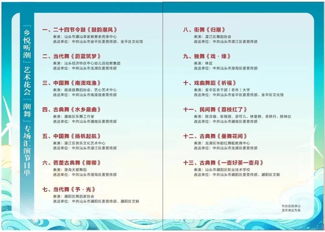 演出在激昂的《鼓韵潮风》中拉开帷幕,随后各类舞蹈轮番上演:当代舞《蔚蓝筑梦》以灵动舞姿展现汕头海滨自然之美,《予·光》用肢体传递温暖希望;中国舞《南澳戏渔》跳出南澳渔民满载而归的鲜活喜悦,《扬帆起航》勾勒出千年古港的历史厚重与活力;古典舞《一壶好茶一壶月》将侨乡底蕴与工夫茶香融入舞步,民间舞《荔枝红了》满是丰收的热闹气息,街舞《归潮》则以潮流形式诉说浓浓乡愁.......